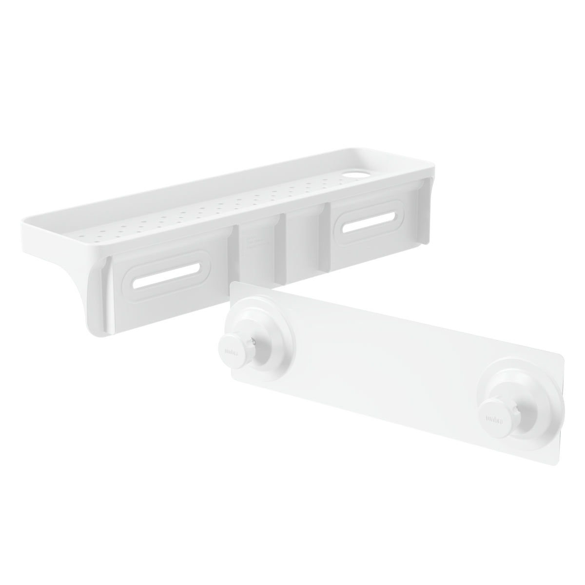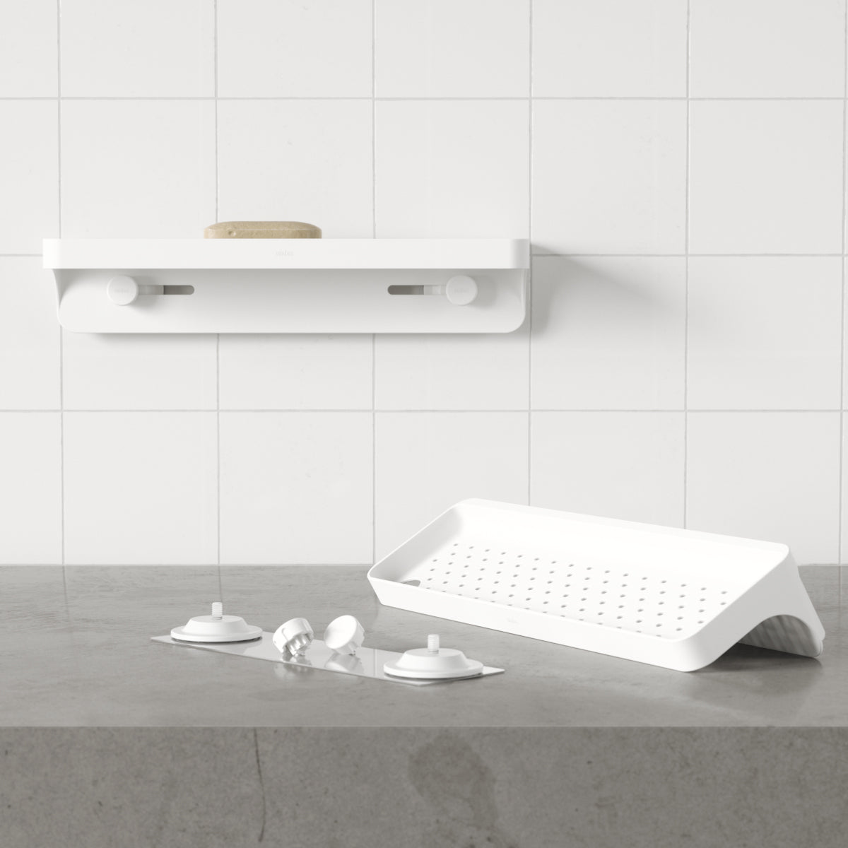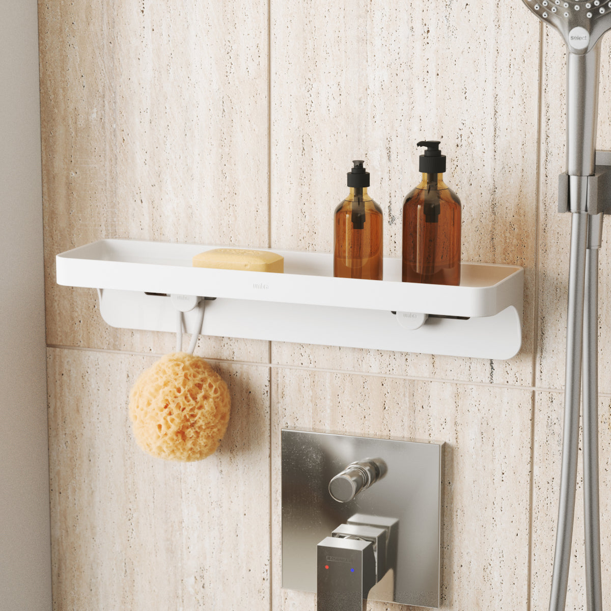 ■カウンターやシャワー スペースを整理整頓できるフレックス アドヒーシブ シェルフは、あらゆるタイプの収納に使用できるモダンなバスルーム シェルフです。