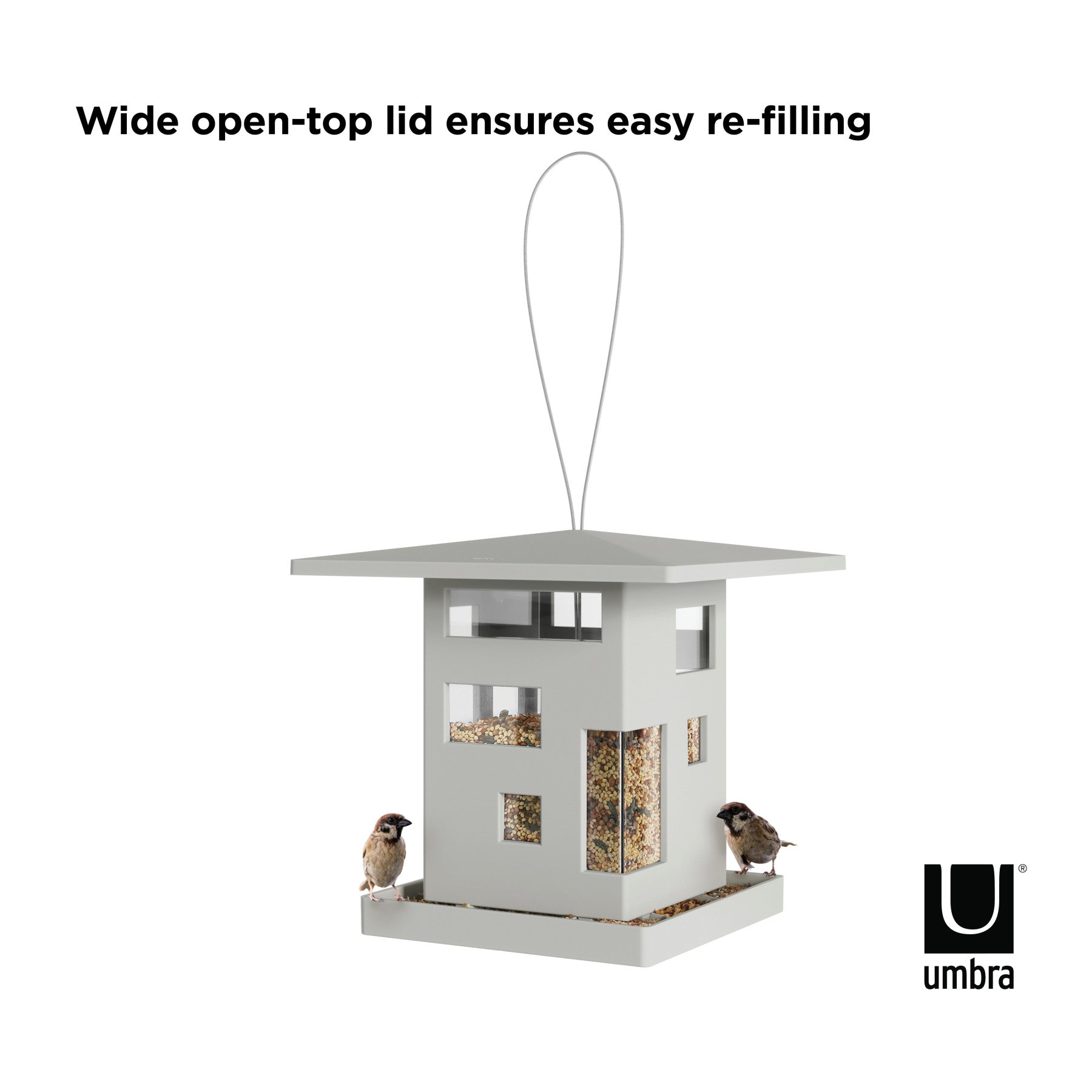 屋根の形をした上蓋を開いて、簡単に餌の補充ができます。内容量は約2Lです。